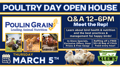 We will be RAFFLING OFF A FREE 50-LB BAG OF CHICK FEED, every hour during the event! Not to mention in-store specials, plus take home some Free Poulin Grain® & Klem's Swag!