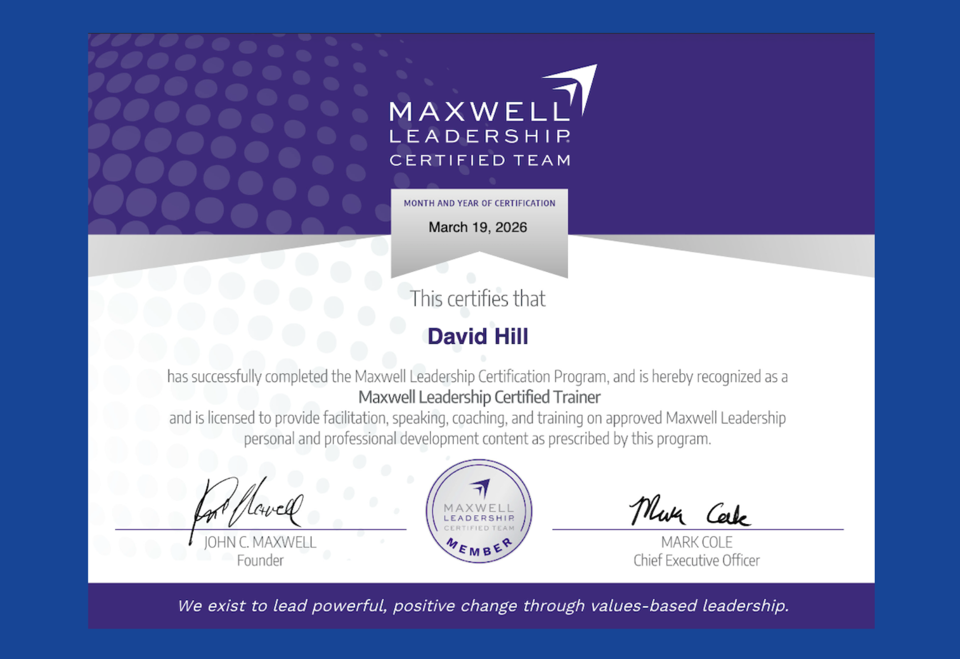 The John Maxwell Company is widely regarded as the world's premier leadership development organization, with a reach spanning more than 170 countries. This certification in both Training and Coaching positions David to serve his clients at an even deeper level, blending world-class leadership principles with his battle-tested sales expertise.